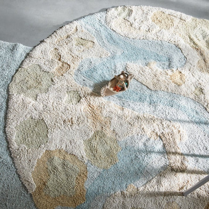 This beautiful landscape rug with a play canoe is perfect for playing on the floor. The tufted landscape made of 100 % cotton is both soft to sit on and fun to play with. It adds some adventurous mood to any children's room.