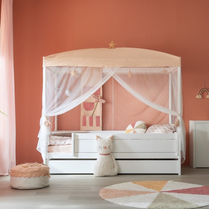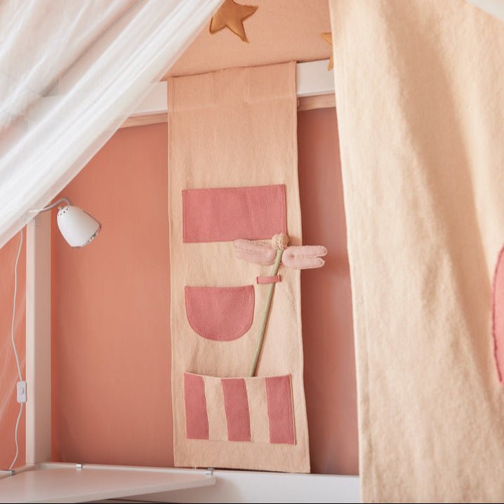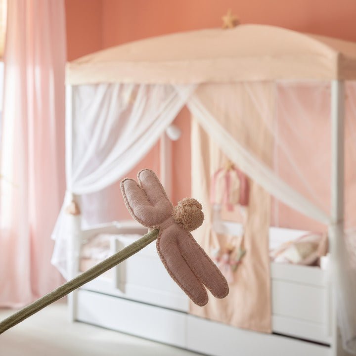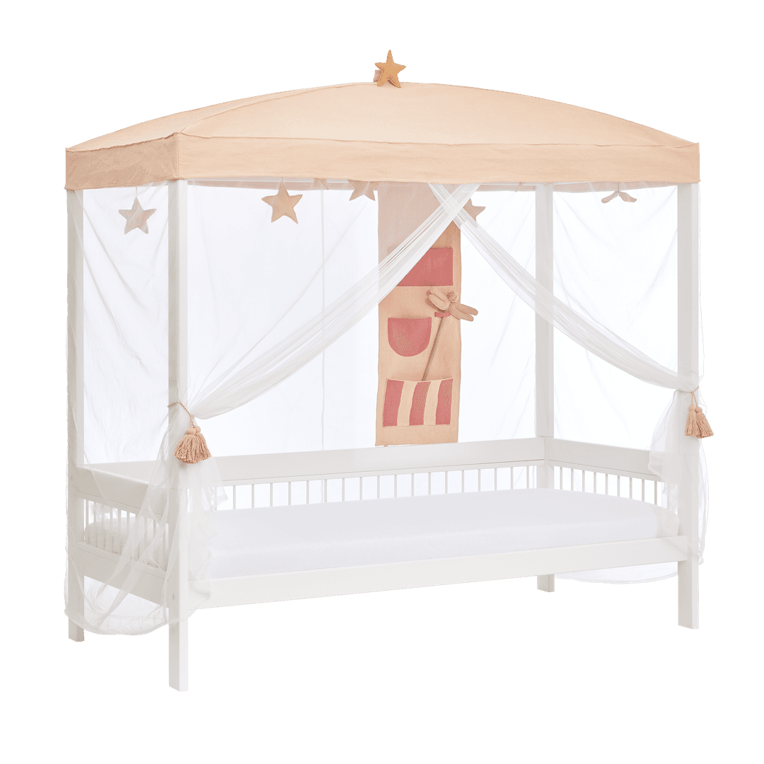 The playful back panel with pockets offers smart storage in reach of the bed and comes with a magical dragonfly wand. Fits perfectly together with the canopy or play curtain from the Fairy Theatre theme.