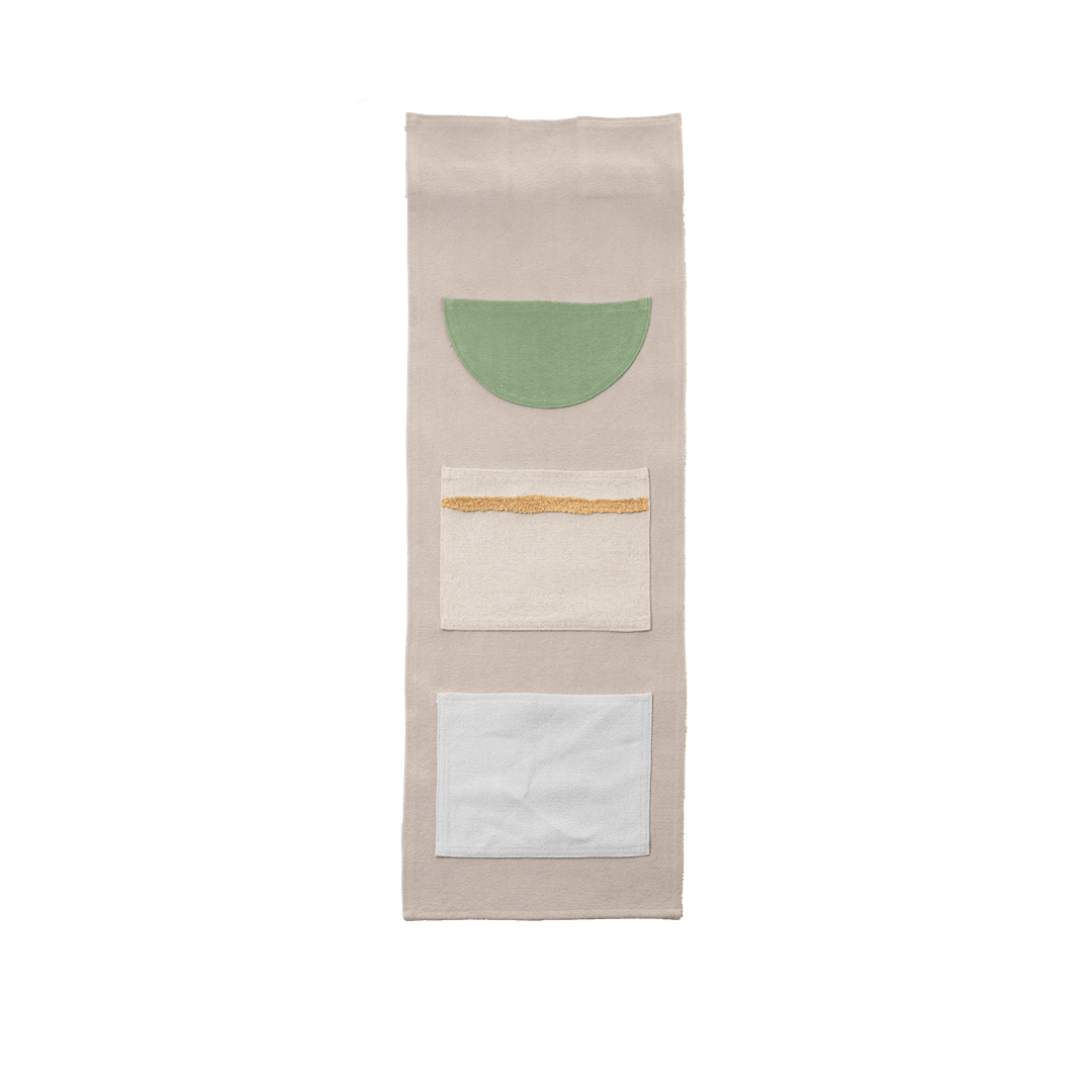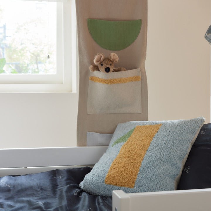 Use this back panel with pockets to add smart storage in reach of the bed. Created in collaboration with Lorena Canals, made of certified materials.
