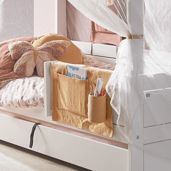 The HONEY GLOW pocket hanger can be attached to the bedside and offers clever storage for small items. The hanger matches with the other articles from the HONEY GLOW or BUTTERFLIES theme. This pocket hanger has been designed in collaboration with Lorena Canals, creator of the washable rug concept. Made with 100 % natural cotton and dyes to ensure durability after washing, comfort, and safety every day.