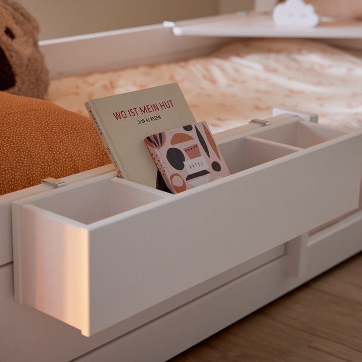 The white lacquered children's furniture from LIFETIME Kidsroom is made of solid pine wood without knots to avoid the typical discolouration and unevenness caused by knots. The surface is treated with environmentally friendly water-based white furniture lacquer and hardened with UV light, which ensures an easy-to-clean and resistant surface. For our white lacquered articles, we use MDF for fronts, fillings, doors and drawer fronts. Due to the use of different materials, there may be slight differences in colour and pattern.