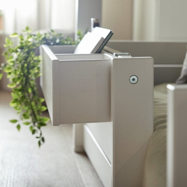 For our children's beds in the colour whitewash, we use solid pine wood with knots for all parts of the bed. This emphasises the natural look of the furniture and the wooden pattern. The surface of the wood is treated with water-based lacquer, which contains fewer white pigments than the white lacquer, allowing the natural wood pattern to shine through. The whitewash lacquer leaves some open pores on the surface, which can lead to normal light discolouration over time. The Whitewash colour can be refreshed with our Whitewash refresher set Art. 500.