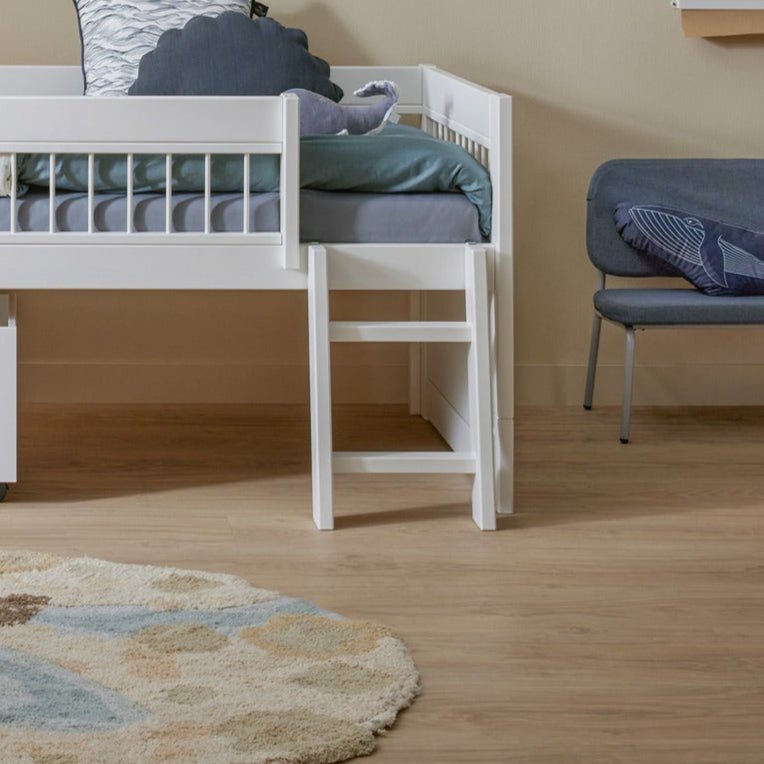 Til vores børnesenge i farven hvidpigmenteret bruger vi massivt fyrretræ med knaster til alle dele af sengen. Dette understreger møblernes naturlige udseende og træstruktur. Træets overflade er behandlet med vandbaseret lak, som indeholder færre hvide pigmenter end den hvide lak, hvilket lader det naturlige træstruktur skinne igennem. Lakken efterlader nogle åbne porer på overfladen, hvilket kan føre til normal lys misfarvning over tid. Lakken kan genopfriskes med vores Refresh Kit art. 500.