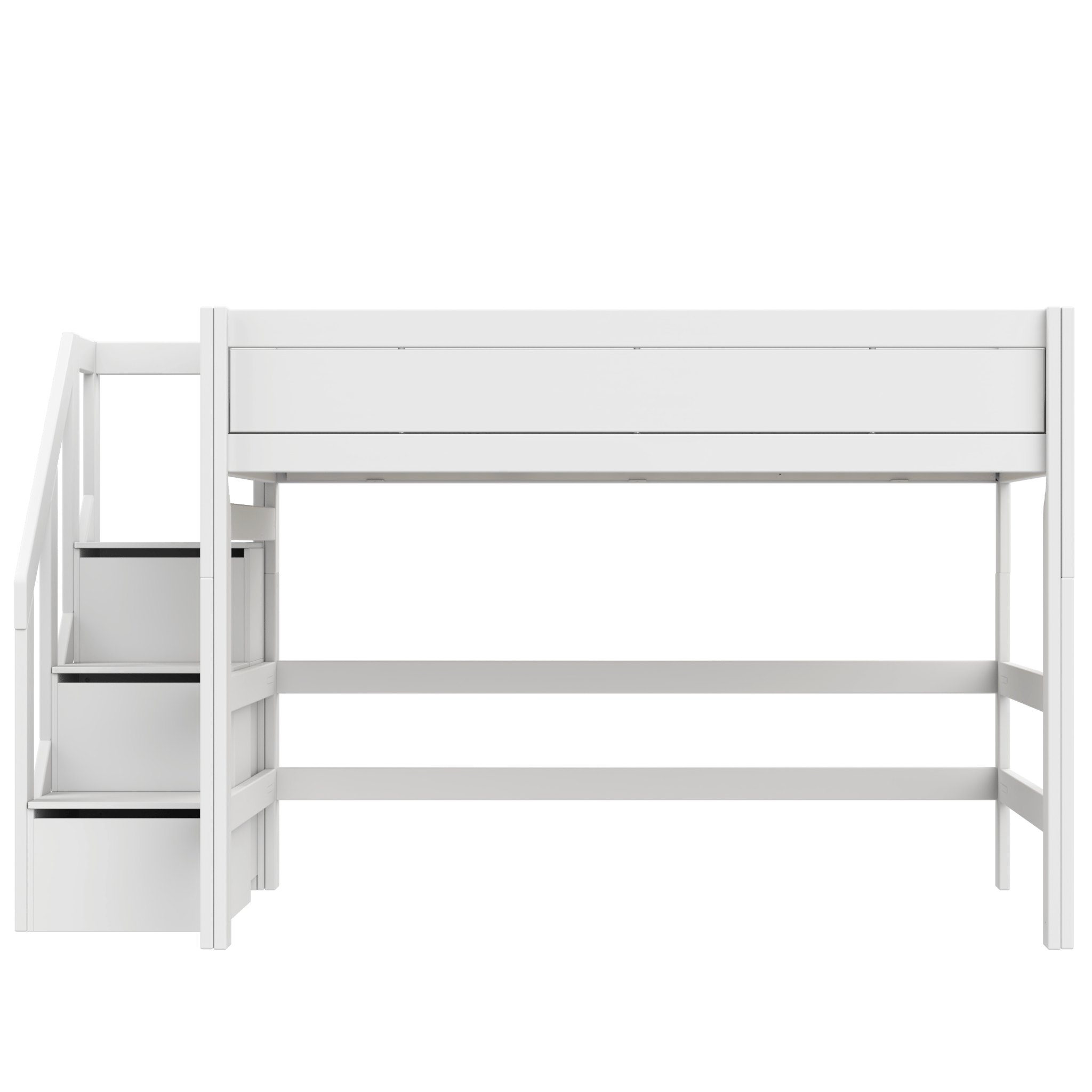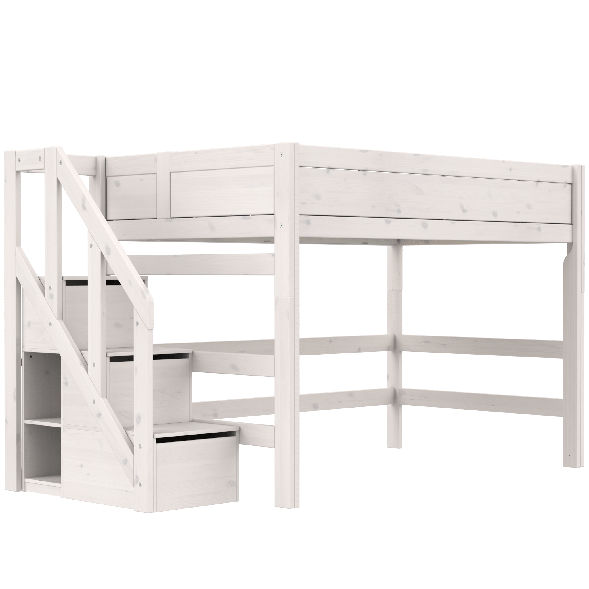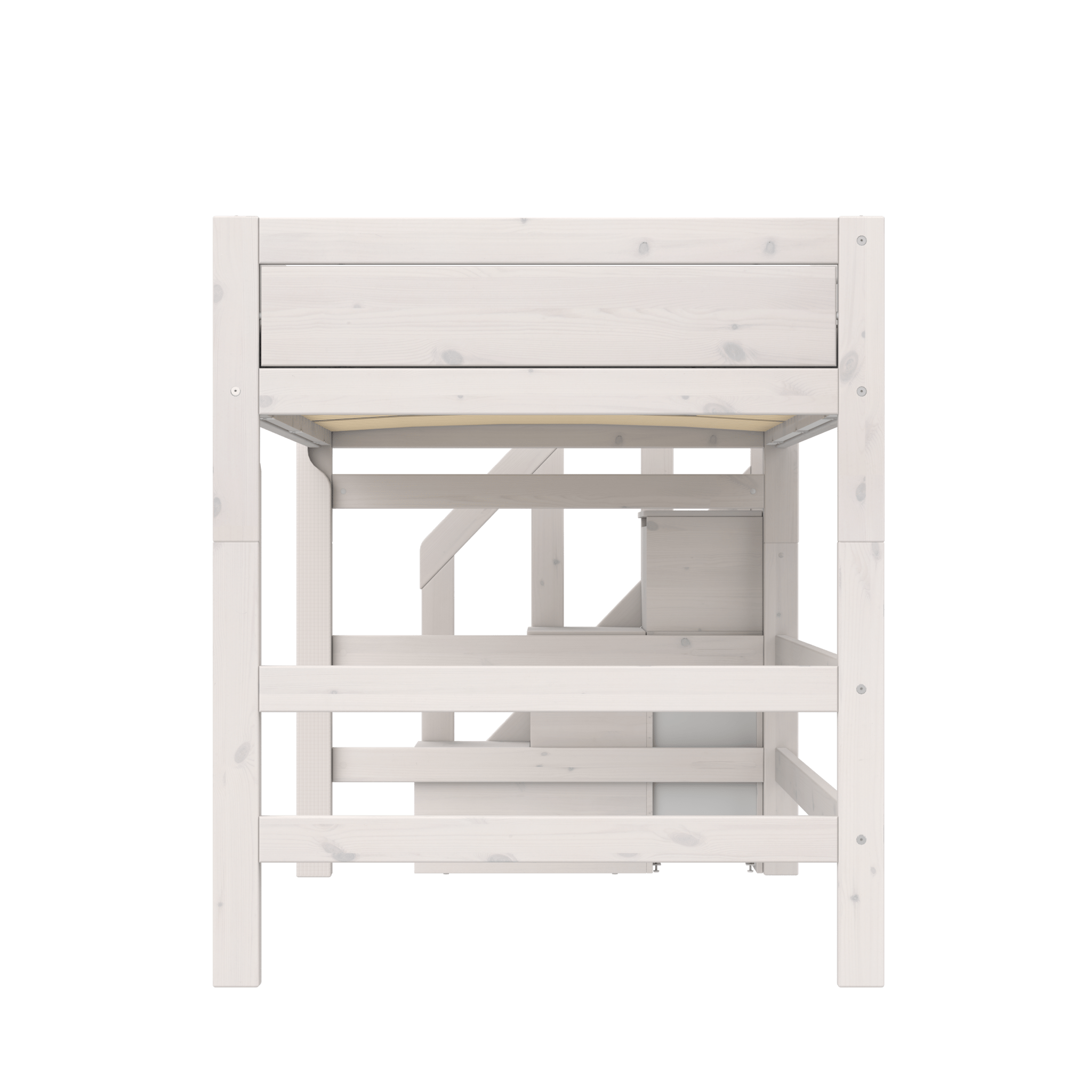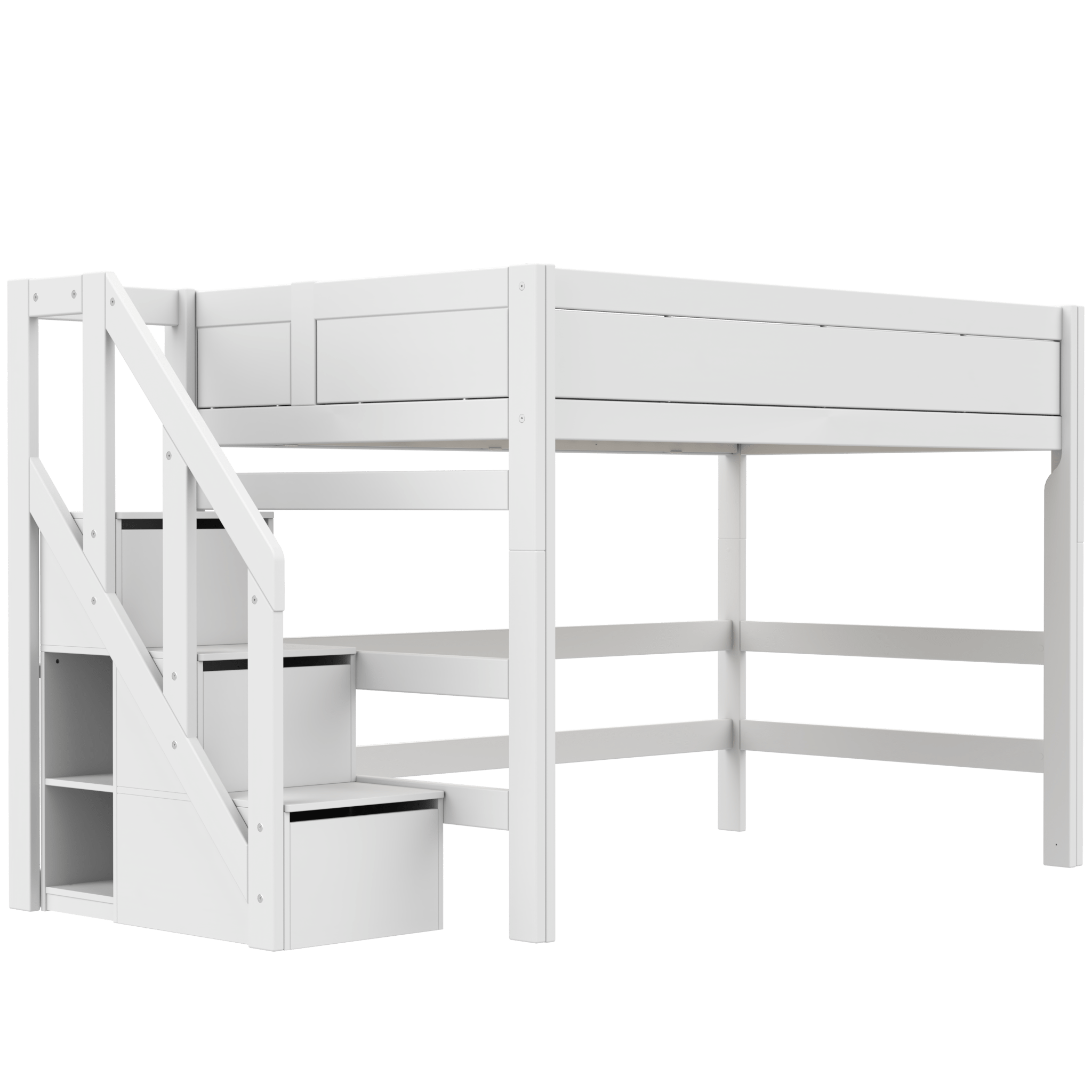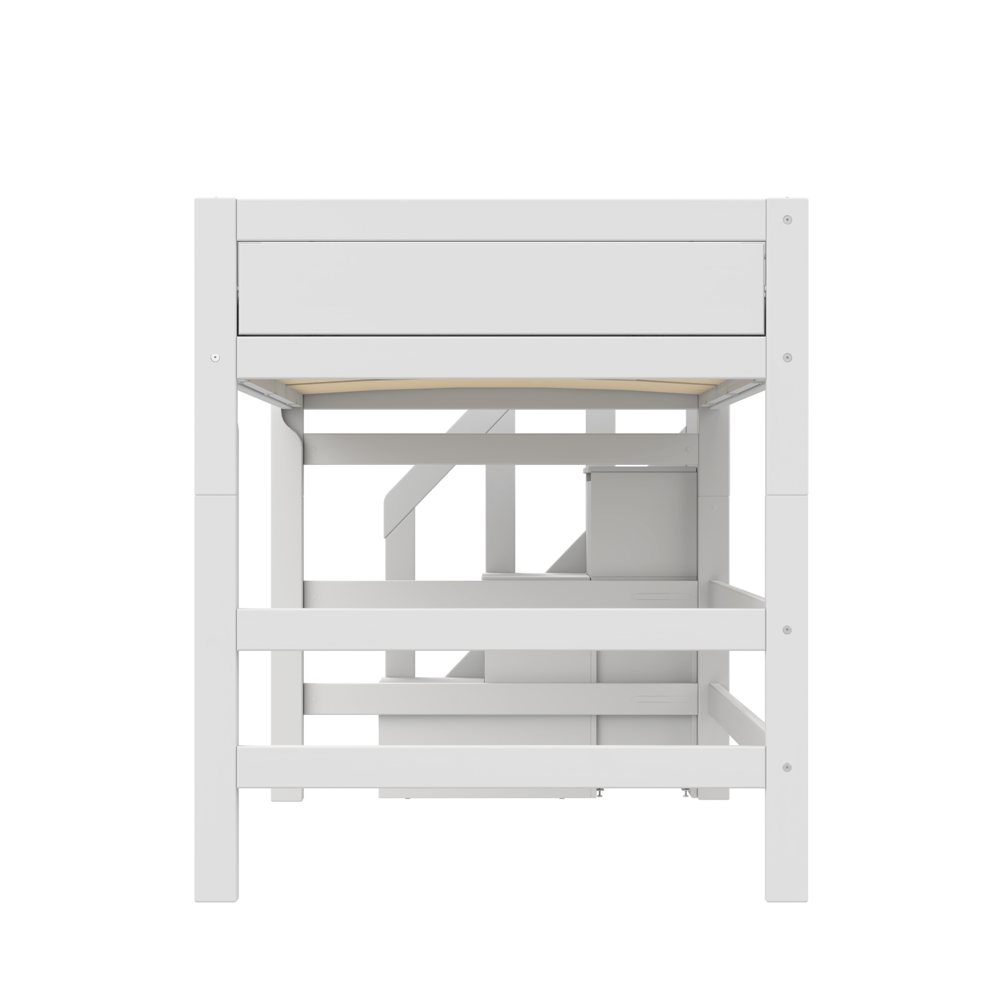 Trappen kan placeres på enten højre eller venstre side af sengen, hvilket giver dig større fleksibilitet, når du indretter børneværelset. Derudover fungerer den smarte trappe også som opbevaring med rummelige skuffer i trinene og en hylde på siden.