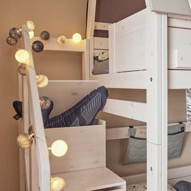 Med vores Hangout fra LIFETIME Kidsrooms får du ikke bare en seng i gulvhøjde, men også en legeplads i højden med en stabil trappe og smarte vinduer.