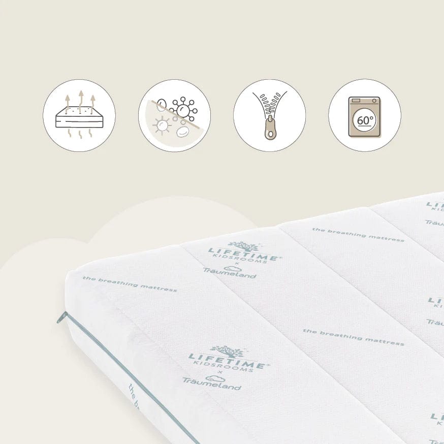 LIFETIME X TRÄUMELAND Advanced åndbar madras til børn er lavet af en slidstærk 12 cm spidselastisk koldskumskerne med åbne porer med vandrette luftkanaler for optimal ventilation og luftcirkulation. Madrassen har to forskellige hårdhedsgrader på grund af forskellige bølgekontursnit. En smidig blødere side og en medium fast side. Vi anbefaler at vende madrassen til den medium faste side, når barnet når cirka 35 kg.