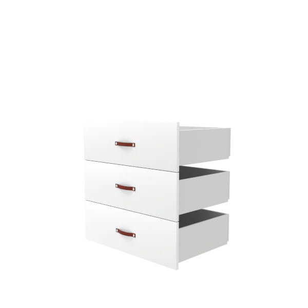 Use this set of 3 drawers in combination with the ALL-IN-ONE Storage Unit Base, art. 520. This article is part of our ALL-IN-ONE Storage System. You can mix and match the articles to build the storage you need or to create a chest of drawers. They are a range of modular furniture units made to stand free or to fit under different types of beds. If you order the articles to fit under your bed, make sure that they match the height of your bed. Customize your articles with the handles you like.