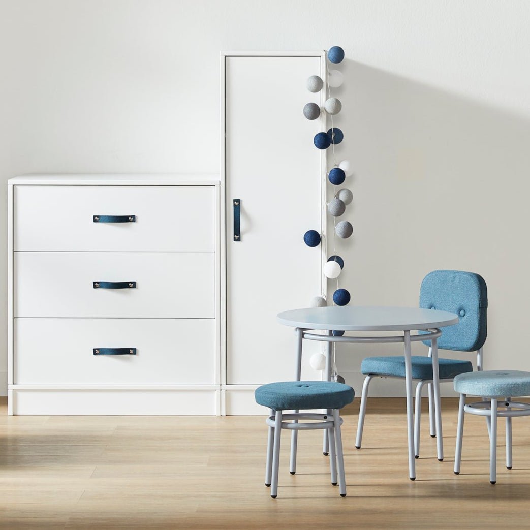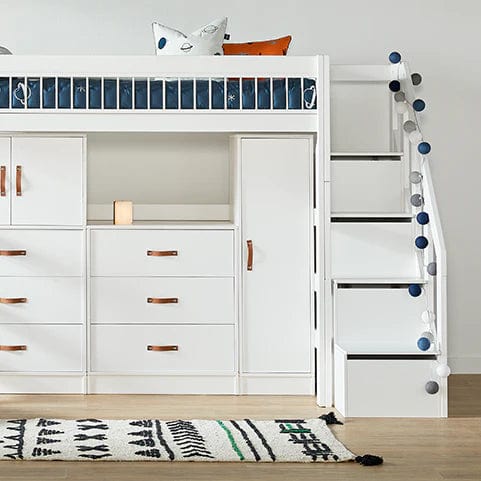 Die weiß lackierten Kindermöbel von LIFETIME Kidsroom bestehen aus massivem Kiefernholz ohne Äste, um die typische Verfärbung und Unebenheiten durch Äste zu vermeiden. Die Oberfläche ist mit umweltfreundlichem, wasserbasiertem weißem Möbellack behandelt und mit UV-Licht gehärtet, was eine leicht zu reinigende und widerstandsfähige Oberfläche gewährleistet. Für unsere weiß lackierten Artikel verwenden wir MDF für Fronten, Füllungen, Türen und Schubladenfronten. Durch die Verwendung unterschiedlicher Materialien kann es zu leichten Farb- und Musterabweichungen kommen.
