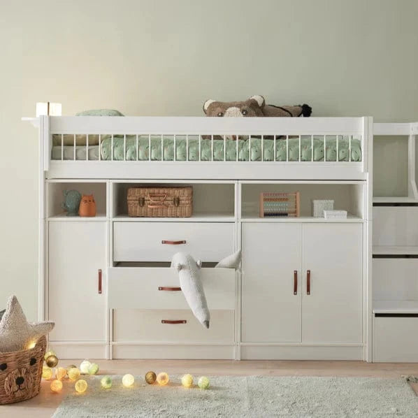 You can avoid buying an extra wardrobe and your child can take out their clothes themselves, as all storage modules are at the same height as the child. The headboards on each side allow your child to sleep safely up high.