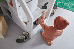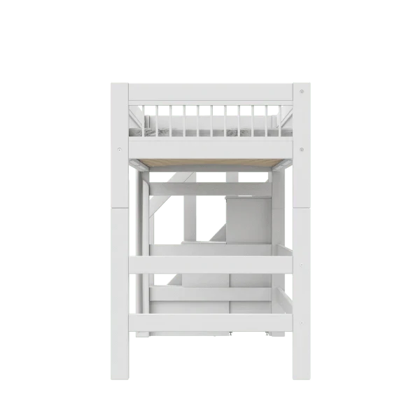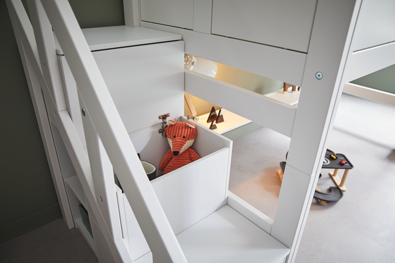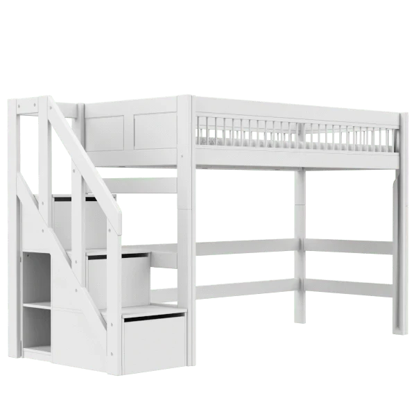 Das Mittelhochbett mit seitlicher Treppe kombiniert leichten und sicheren Aufstieg mit cleverem Stauraum und bietet einen schönen Spielbereich unter dem Bett an. Man kann den Bereich unter dem Bett mit einem Spielforhang, Spielmatratzen, Regalen und Accessoires in einen vielfältigen Bereich verwandeln. In den drei Treppenstufen befinden sich drei geräumige Aufbewahrungsbereiche. Die Stufen öffnen sich nach oben und sind mit Soft-close Technologie versehen. Die Sicherheitsöffnung an der Front der Stufen hilft dabei das Klemmen von Fingern zu vermeiden. Das Treppenmodul verfügt ebenfalls über ein seitliches Bücherregal.