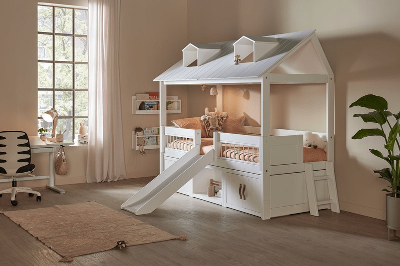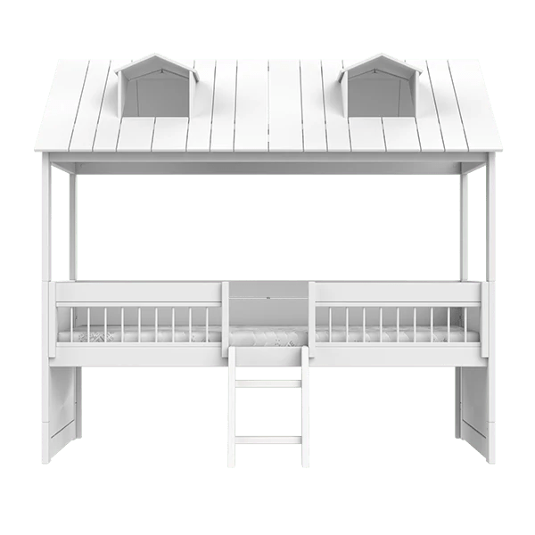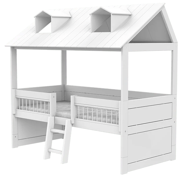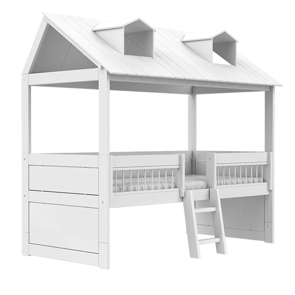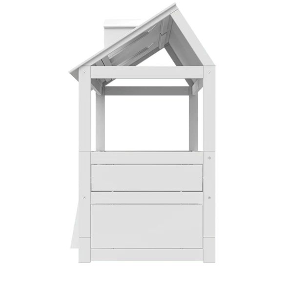 Das Kojenbett mit Beach House Dach ist ein wunderschönes Themenbett im Strandhaus Stil und zusätzlichem Aufbewahrungsplatz unter dem Bett. Die ikonischen Verandafronten mit Sprossen laden zum Verweilen, Spielen und Schlafen ein. Die Dachelemente mit Gaube sind ein tolles Highlight zum Herausschauen und Spielen. Das Beach House ist ein beliebtes Bett was ultimativ zum Fokuspunkt im Kinderzimmer wird. Die kleine einhänge Leiter erlaubt auch den kleinsten Kindern einen bequemen Einstieg und kann genau wie das Dach später leicht entfernt werden.