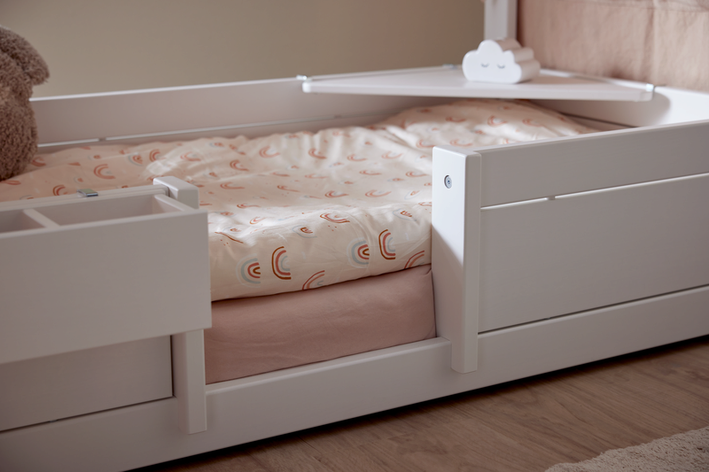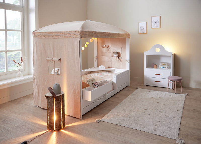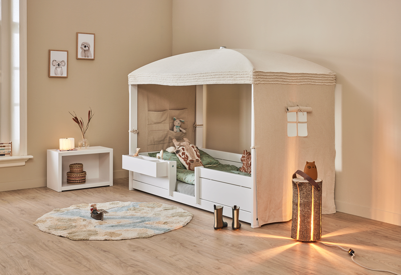 Die tiefe Version des 4-in-1 Bettes ist ideal für besonders kleine Kinder, die bereits hier lernen selbständig in und aus dem Bett zu klettern. Dieser Aufbau kann als geräumiges Juniorbett benutzt werden, wo das Kind risikofrei Selbständigkeit üben kann. Mit einem weichen Stoffhimmel lädt das Bett noch mehr zum Träumen ein.