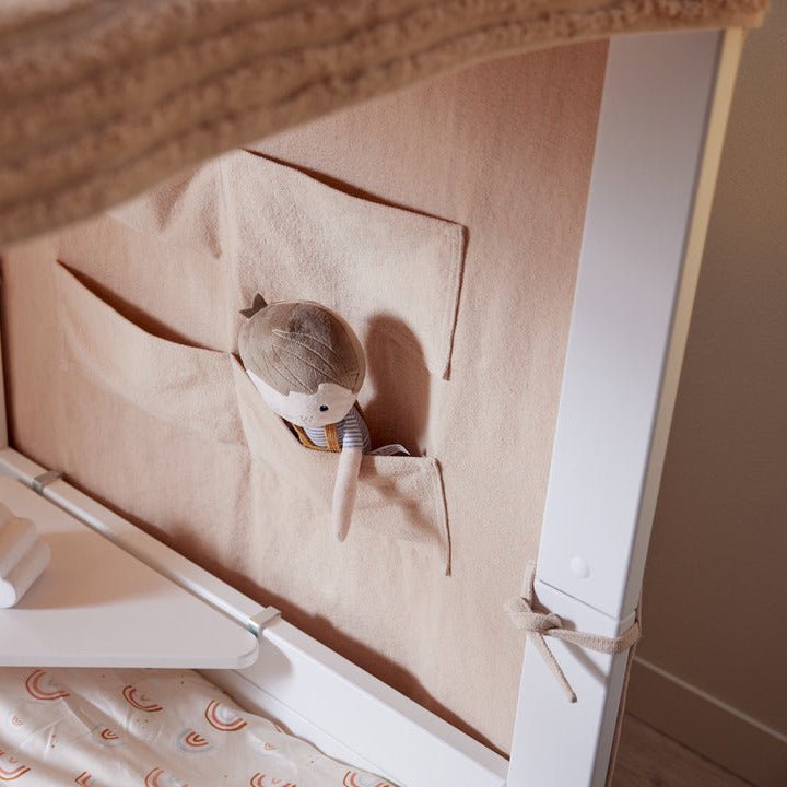 Der Baldachin ist in zwei verschiedenen Farben erhältlich: Natur und Pfirsich. Der Baldachin besteht zu 100 % aus recycelbarer Baumwolle.