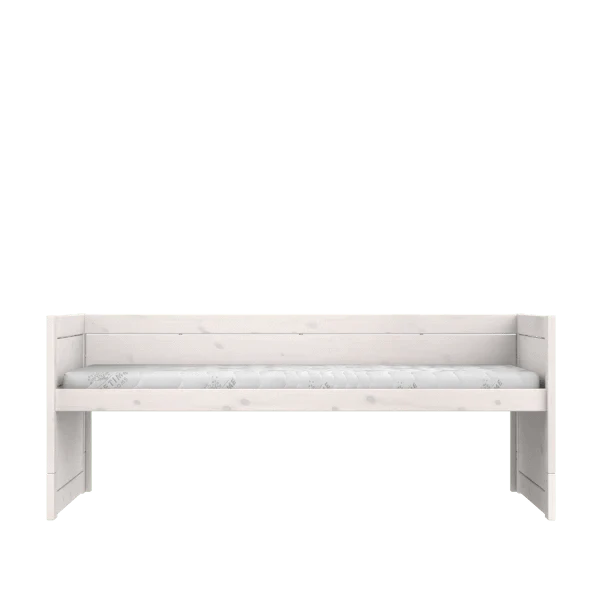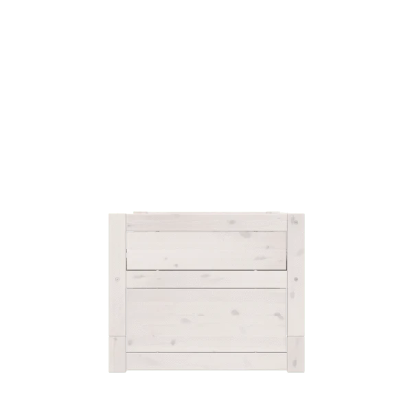 For our children's beds in the colour whitewash, we use solid pine wood with knots for all parts of the bed. This emphasises the natural look of the furniture and the wooden pattern. The surface of the wood is treated with water-based lacquer, which contains fewer white pigments than the white lacquer, allowing the natural wood pattern to shine through. The whitewash lacquer leaves some open pores on the surface, which can lead to normal light discolouration over time. The Whitewash colour can be refreshed with our Whitewash refresher set Art. 500.