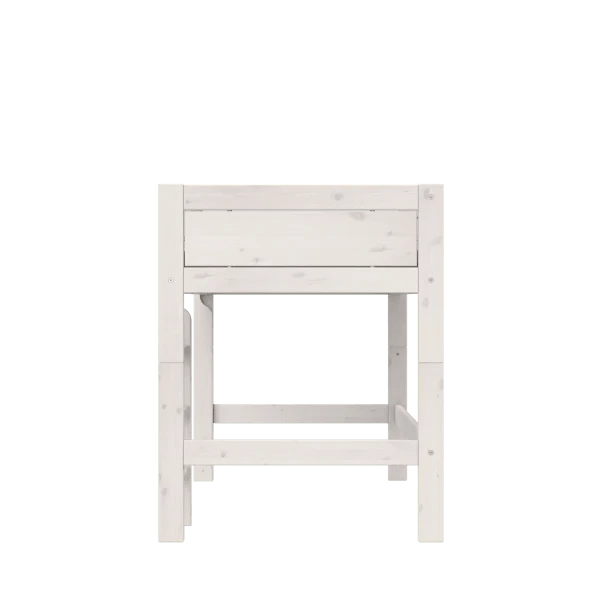Für unsere Kinderbetten in der Farbe whitewash verwenden wir für alle Teile des Bettes massives Kiefernholz mit Ästen. Dadurch wird das natürliche Aussehen der Möbel und des Holzmusters verstärkt. Die Oberfläche des Holzes wird mit wasserbasiertem Lack behandelt, der weniger weiße Pigmente enthält als der weiße Lack, wodurch das natürliche Holzmuster durchscheinen kann. Der whitewash Lack hinterlässt teilweise offene Poren auf der Oberfläche, wodurch es mit der Zeit zu normalen leichten Verfärbungen kommen kann. Die Farbe Whitewash kann mit unserem Whitewash-Auffrischungsset Art. 500 aufgefrischt werden.