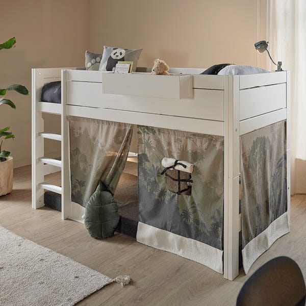 Das halbhohe Bett mit gerader Leiter ist platzsparend und bietet einen schönen Spielbereich unter dem Bett an. Man kann den Bereich unter dem Bett mit passenden Spielvorhängen, Spielmatratzen, Regalen und Accessoires in ein wundervolles Spieluniversum verwandeln. Das Bett hat die ideale Höhe, um mit einer optionalen Dachkonstruktion aufgerüstet zu werden. Ebenfalls kann dieses Bett mit der Leiter / Turm für Rutsche (Art. 172) und der Rutsche (Art. 170) kombiniert werden.