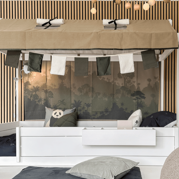 Dieses Montessori-Bett wird mit einer oberen Konstruktion verkauft, die es Ihnen ermöglicht, ein kuscheliges Stoffdach hinzuzufügen, von dem wir eine große Auswahl anbieten, die Sie hier finden.