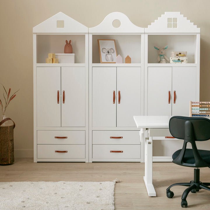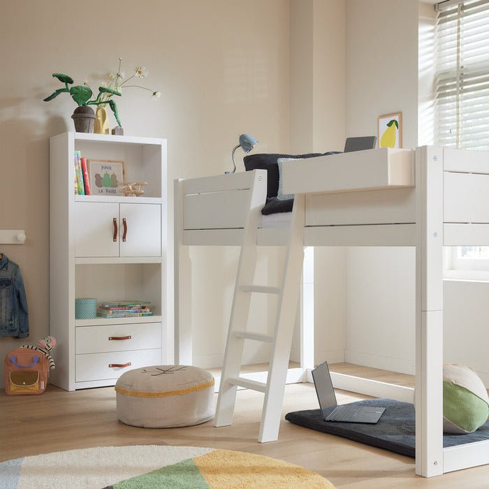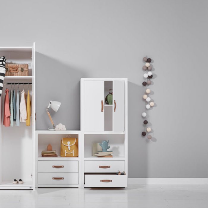The white lacquered children's furniture from LIFETIME Kidsroom is made of solid pine wood without knots to avoid the typical discolouration and unevenness caused by knots. The surface is treated with environmentally friendly water-based white furniture lacquer and hardened with UV light, which ensures an easy-to-clean and resistant surface. For our white lacquered articles, we use MDF for fronts, fillings, doors and drawer fronts. Due to the use of different materials, there may be slight differences in colour and pattern.