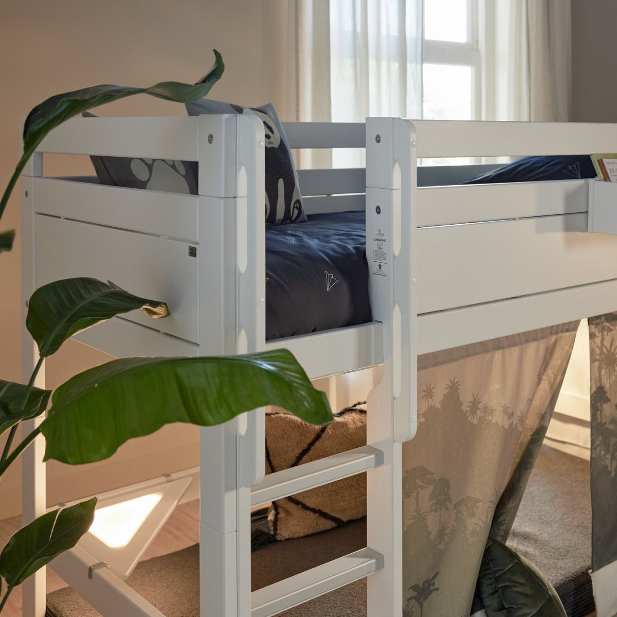 The white lacquered children's furniture from LIFETIME Kidsroom is made of solid pine wood without knots to avoid the typical discolouration and unevenness caused by knots. The surface is treated with environmentally friendly water-based white furniture lacquer and hardened with UV light, which ensures an easy-to-clean and resistant surface. For our white lacquered articles, we use MDF for fronts, fillings, doors and drawer fronts. Due to the use of different materials, there may be slight differences in colour and pattern.