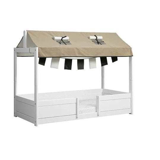 The fabric roof can be attached and removed easily with Velcro connections. The theme is gender neutral and invites any child to play and hang out. The fabric roof is made of cotton and PES and has fine handmade window details with soft teddy fabric. The garland is included.