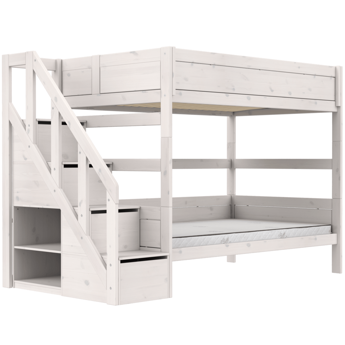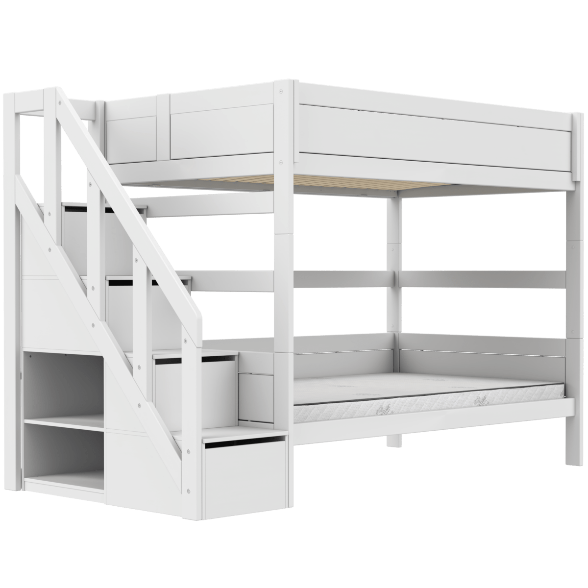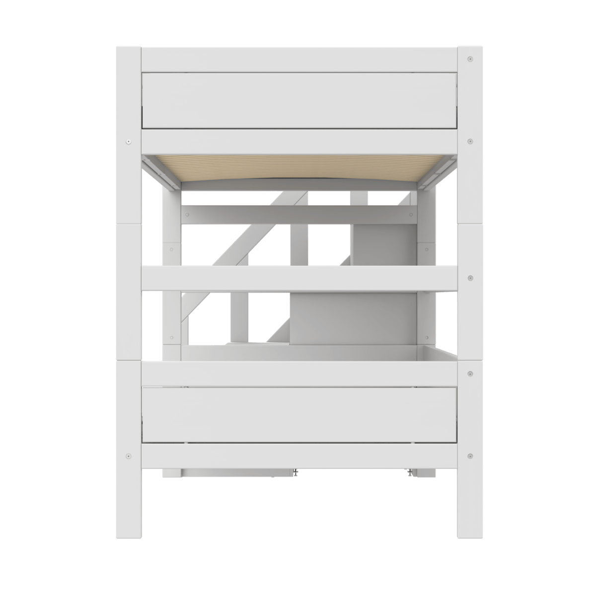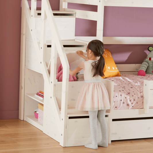 The staircase can be placed on either the right or left side of the bed, giving you greater flexibility when arranging the children's room. Additionally, the smart staircase doubles as storage, featuring spacious drawers in the steps and a shelf on the side.
