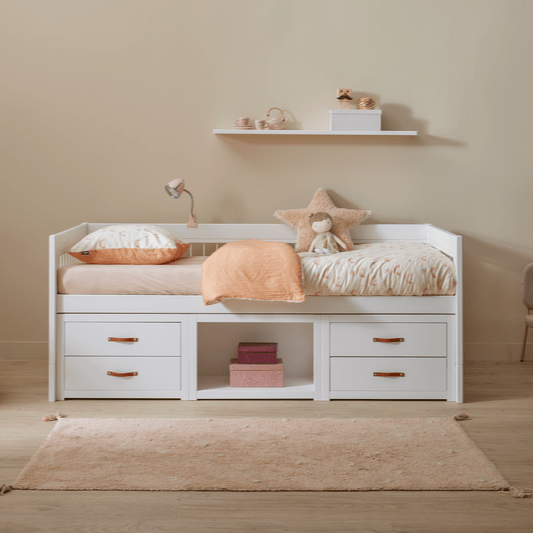 The white lacquered children's furniture from LIFETIME Kidsroom is made of solid pine wood without knots to avoid the typical discolouration and unevenness caused by knots. The surface is treated with environmentally friendly water-based white furniture lacquer and hardened with UV light, which ensures an easy-to-clean and resistant surface. For our white lacquered articles, we use MDF for fronts, fillings, doors and drawer fronts. Due to the use of different materials, there may be slight differences in colour and pattern.
