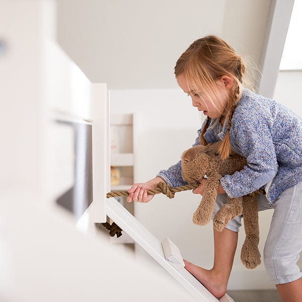 Le lit cabane avec escabeau et toboggan invite les enfants à grimper sur l'échelle de corde à une extrémité du lit, à prendre un repos bien mérité en haut, puis à redescendre à l'extrémité opposée. Le lit multiple combine plusieurs des activités préférées des enfants.