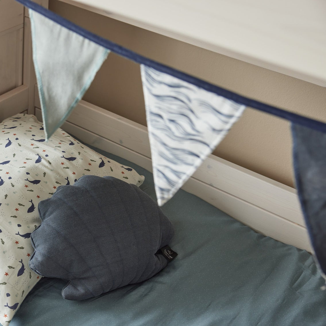 Pour nos lits d'enfants blanchis à la chaux, nous utilisons du bois de pin massif avec des nœuds pour toutes les parties du lit. Cela améliore l'aspect naturel du meuble et le motif en bois qui laisse transparaître la lumière à travers la laque. La surface du bois est traitée avec une laque à base d'eau qui contient moins de pigments blancs que la laque blanche, ce qui lui confère un aspect naturel.