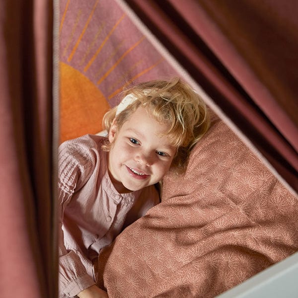 Gebruik de House Bed Cover SUNSET DREAMS voor de constructie van je House Bed en creëer een gezellige slaapervaring. Je kunt de SUNSET DREAMS poef, het tapijt of gevormde kussens toevoegen om je kamer verder te transformeren in een zonsondergangpanorama.