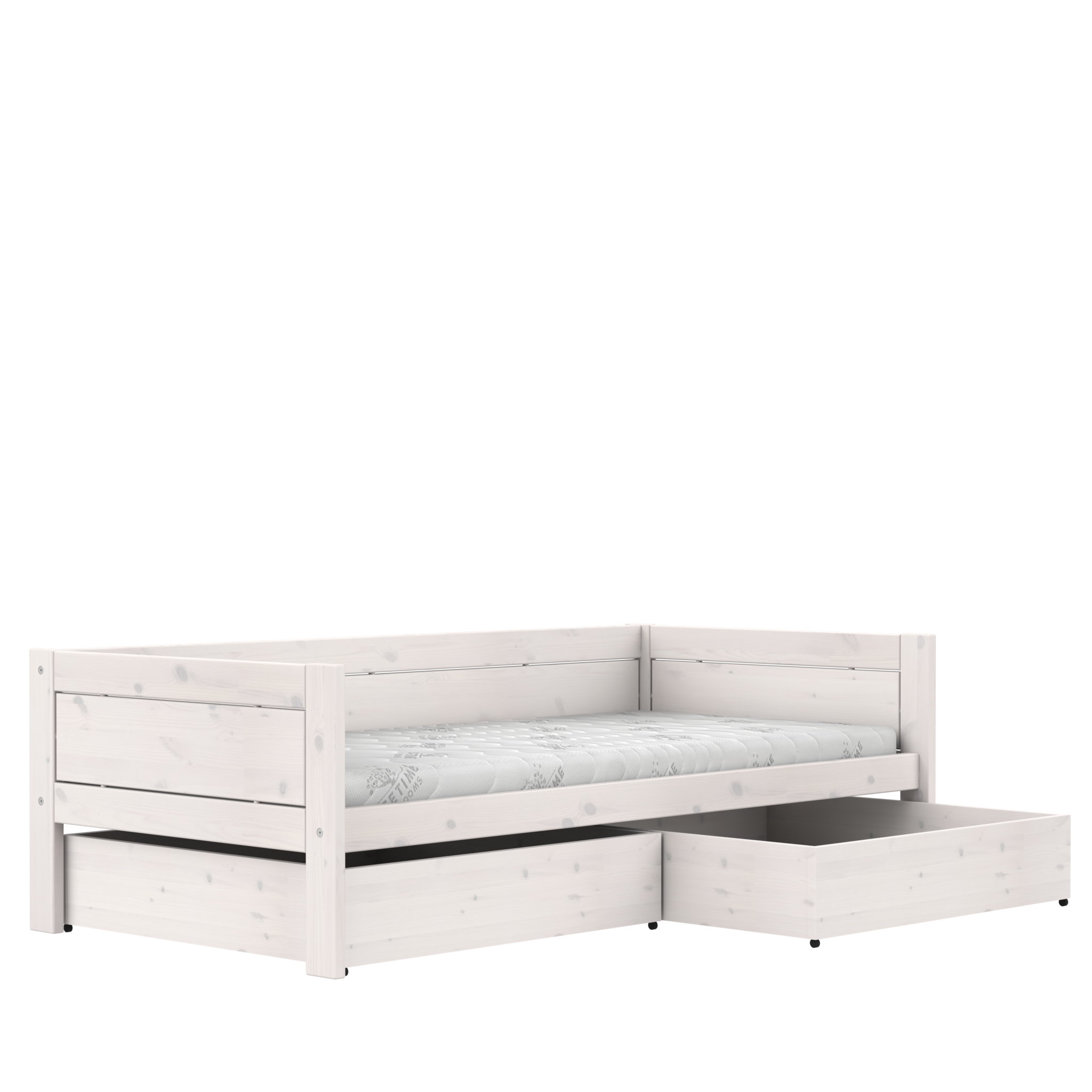 Voor onze kinderkamer meubelen in de kleur whitewash gebruiken we massief grenenhout met noesten voor alle onderdelen van het bed. Dit benadrukt de natuurlijke uitstraling van het meubel en de houtnerf. Het oppervlak van het hout is behandeld met op waterbasis vervaardigde lak, die minder witte pigmenten bevat dan de witte lak, waardoor de natuurlijke houtnerf zichtbaar blijft. De whitewash-lak laat enkele open poriën op het oppervlak achter, wat in de loop der tijd tot normale lichte verkleuring kan leiden.