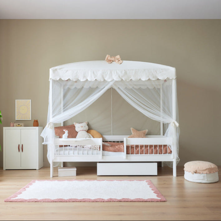 De witgelakte kindermeubelen van LIFETIME Kidsrooms zijn gemaakt van massief grenenhout zonder noesten om typische verkleuringen en oneffenheden door noesten te voorkomen. Het oppervlak is behandeld met milieuvriendelijke, op waterbasis vervaardigde witte meubellak en gehard met UV-licht, wat zorgt voor een eenvoudig schoon te maken en resistent oppervlak. Voor onze witgelakte artikelen gebruiken we MDF onder ander voor fronten, vullingen, deuren en lade-fronten. Door het gebruik van verschillende materialen kunnen er lichte verschillen in kleur en nerf ontstaan.