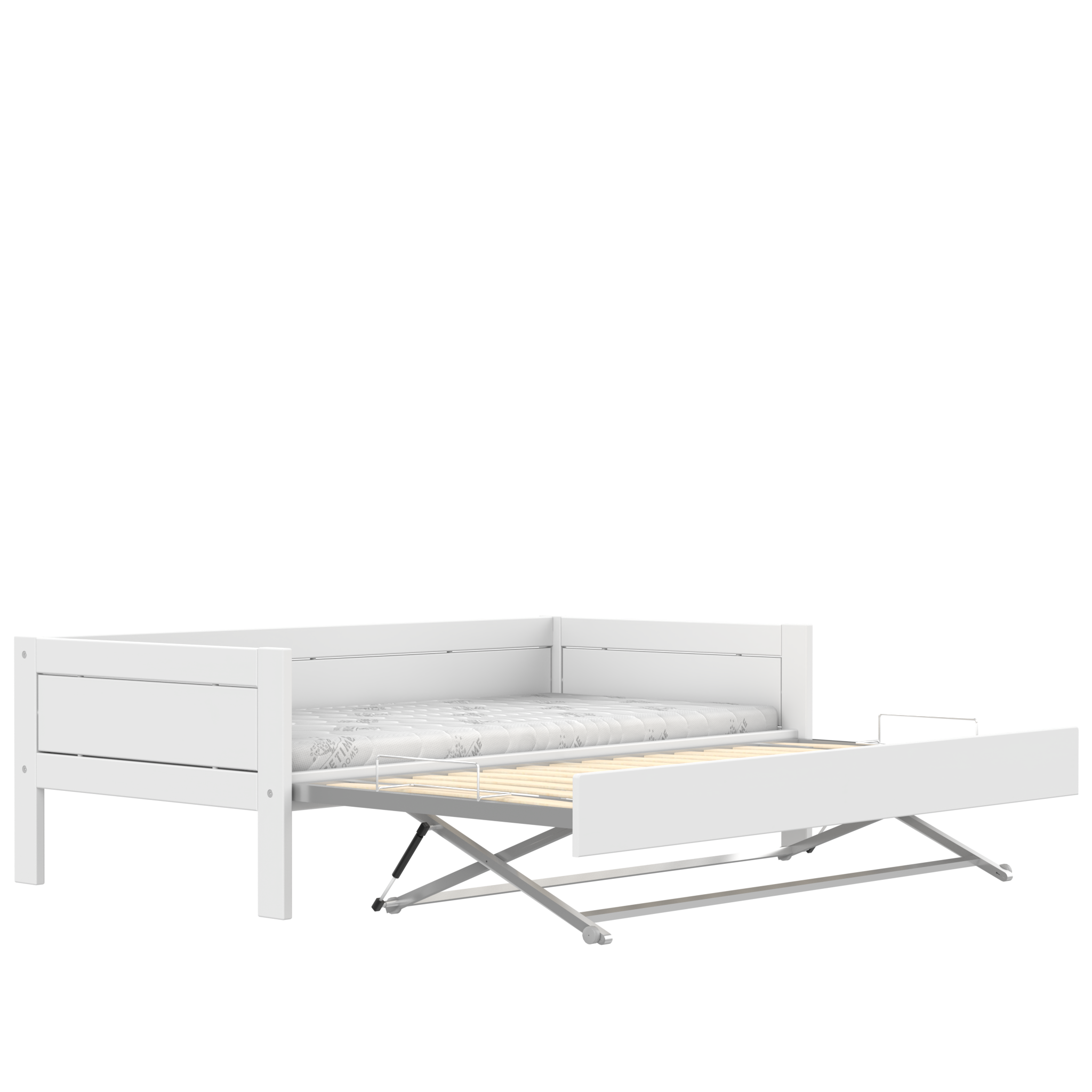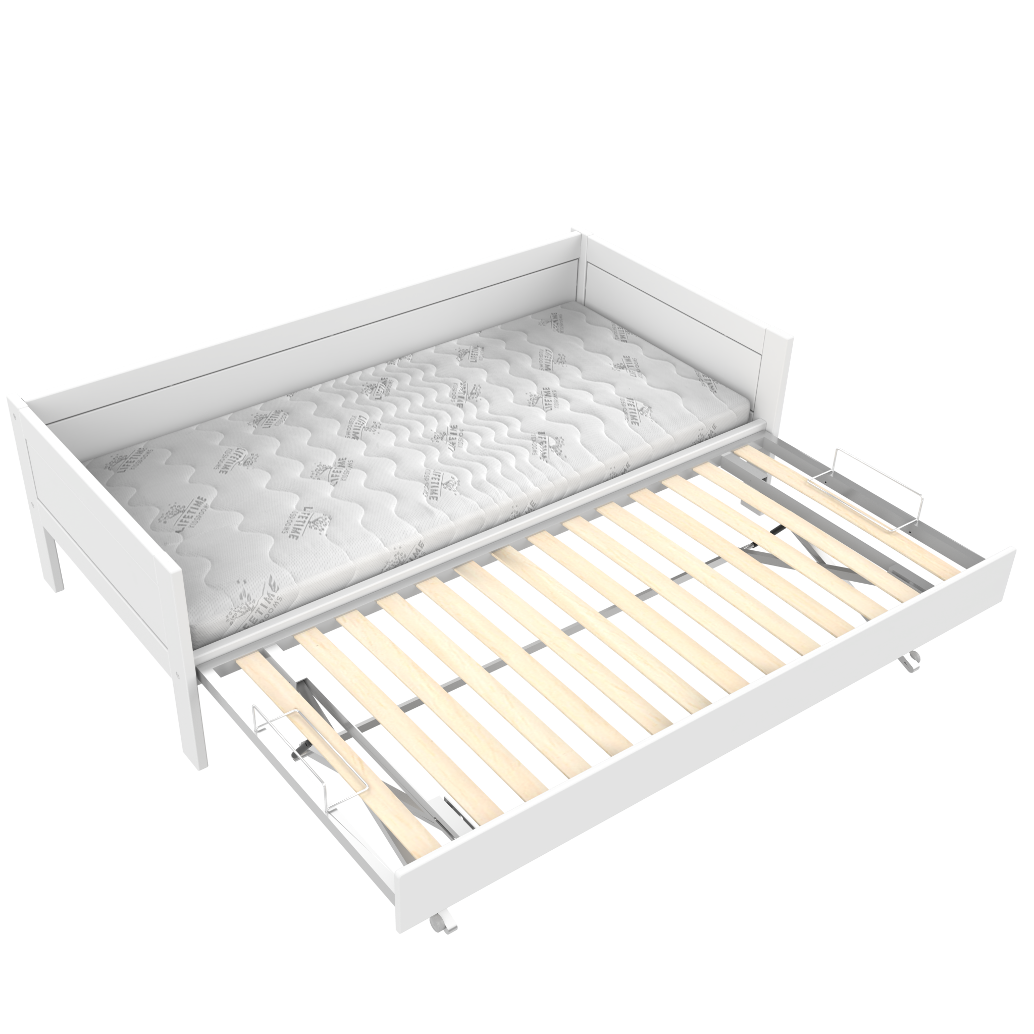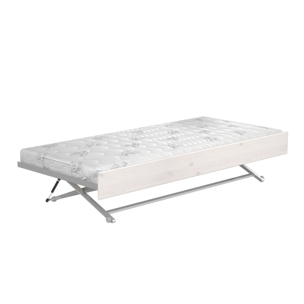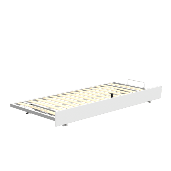 Het logeerbed schuift gemakkelijk naar buiten op ingebouwde wielen. Met een riem in het midden kun je het bed uitklappen en optillen om de hoogte van het bed te evenaren. Dit stelt kinderen in staat om naast elkaar op hetzelfde niveau te slapen.