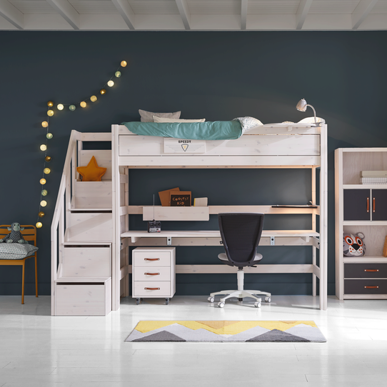 De trap kan aan de rechter- of linkerkant van het bed worden geplaatst, wat je meer flexibiliteit geeft bij het inrichten van de kinderkamer. Bovendien fungeert de slimme trap ook als opslag, met ruime lades in de treden en een plank aan de zijkant.