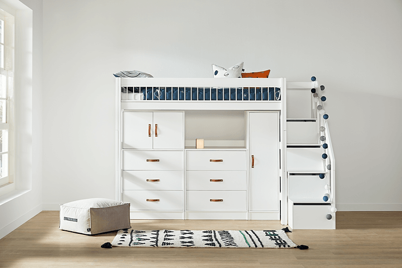 Je kunt het kopen van een extra kledingkast vermijden en je kind kan zelf zijn of haar kleren pakken, aangezien alle opbergmodules op dezelfde hoogte als het kind zijn. De hoofdborden aan elke kant zorgen ervoor dat je kind veilig hoog kan slapen.