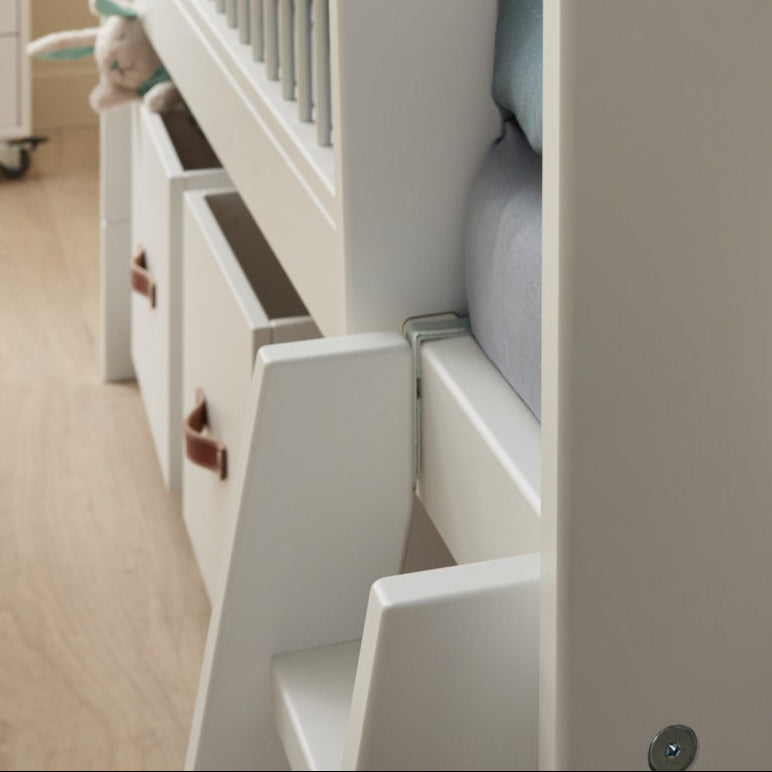 Voor onze kinderkamer meubelen in de kleur whitewash gebruiken we massief grenenhout met noesten voor alle onderdelen van het bed. Dit benadrukt de natuurlijke uitstraling van het meubel en de houtnerf. Het oppervlak van het hout is behandeld met op waterbasis vervaardigde lak, die minder witte pigmenten bevat dan de witte lak, waardoor de natuurlijke houtnerf zichtbaar blijft. De whitewash-lak laat enkele open poriën op het oppervlak achter, wat in de loop der tijd tot normale lichte verkleuring kan leiden.