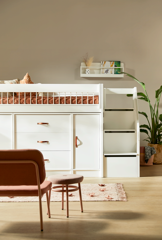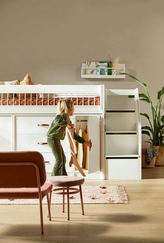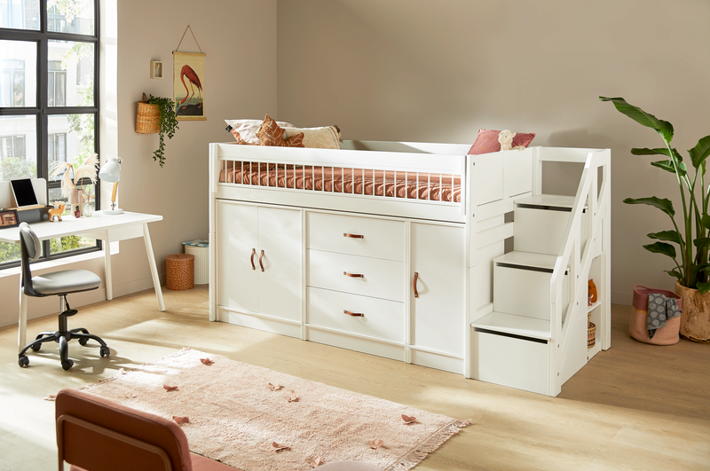 Je kunt het kopen van een extra kledingkast vermijden en je kind kan zelf zijn of haar kleren pakken, aangezien alle opbergmodules op dezelfde hoogte als het kind zijn. De hoofdborden aan elke kant zorgen ervoor dat je kind veilig hoog kan slapen. De trap kan aan zowel de linker- als de rechterkant van het bed worden geplaatst, waardoor je meer opties hebt bij het inrichten van de kamer van je kind.