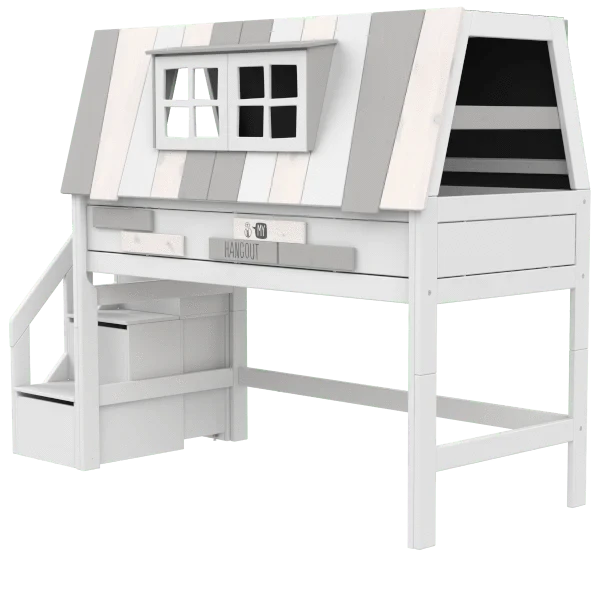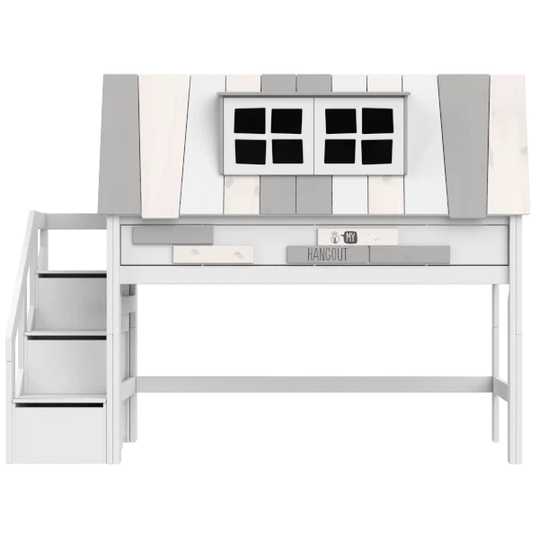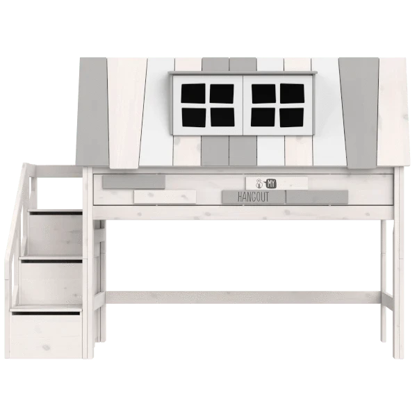 Het My Hangout-dak bovenop fungeert als hoge bedhekken, zodat uw kind veilig hoog kan slapen. De schattige ramen kunnen in het spel worden geïntegreerd, omdat ze geopend kunnen worden en het kind naar buiten kan gluren.
