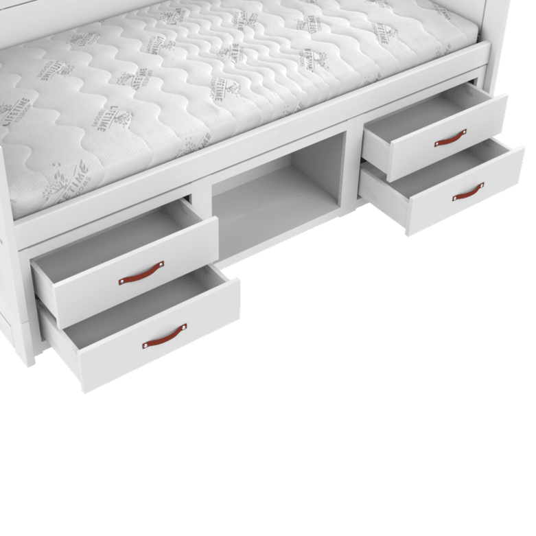 Het kajuitbed bevat 4 laden en een open opbergvak, wat zorgt voor een mooie eenvoudige uitstraling en opbergmogelijkheden.