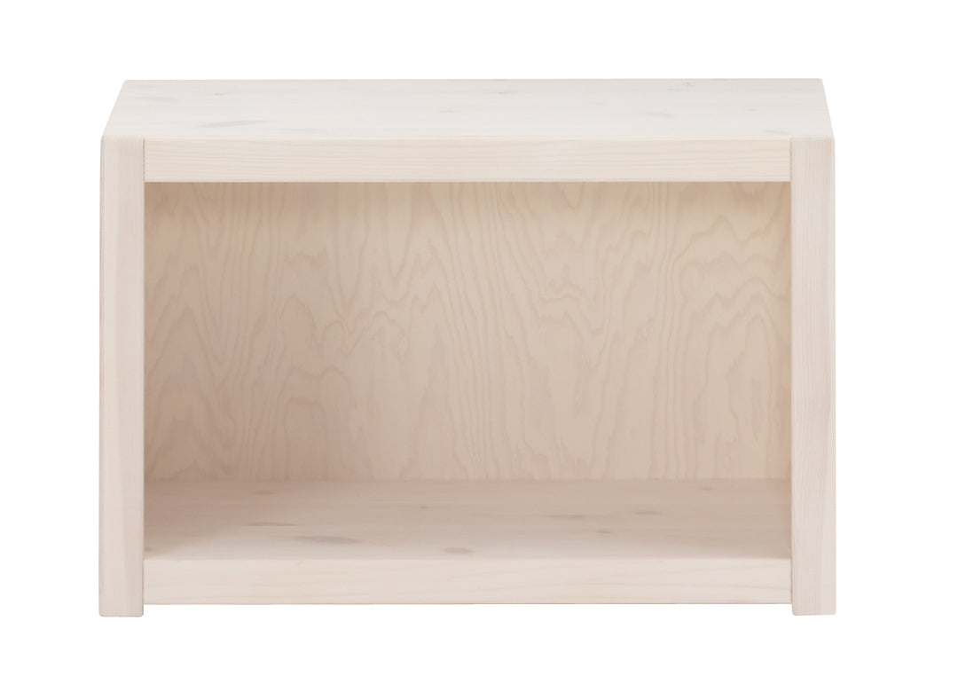 Voor onze kinderkamer meubelen in de kleur whitewash gebruiken we massief grenenhout met noesten voor alle onderdelen van het bed. Dit benadrukt de natuurlijke uitstraling van het meubel en de houtnerf. Het oppervlak van het hout is behandeld met op waterbasis vervaardigde lak, die minder witte pigmenten bevat dan de witte lak, waardoor de natuurlijke houtnerf zichtbaar blijft. De whitewash-lak laat enkele open poriën op het oppervlak achter, wat in de loop der tijd tot normale lichte verkleuring kan leiden.