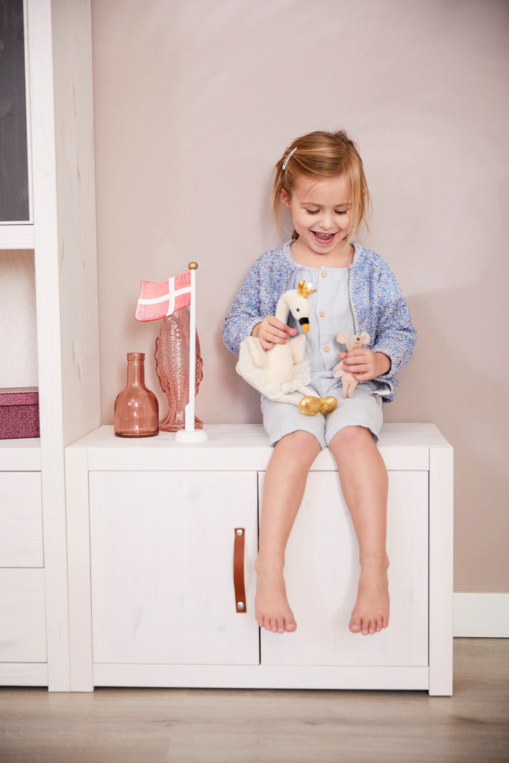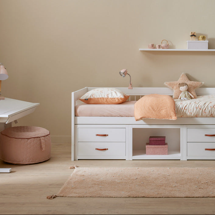 De witgelakte kindermeubelen van LIFETIME Kidsrooms zijn gemaakt van massief grenenhout zonder noesten om typische verkleuringen en oneffenheden door noesten te voorkomen. Het oppervlak is behandeld met milieuvriendelijke, op waterbasis vervaardigde witte meubellak en gehard met UV-licht, wat zorgt voor een eenvoudig schoon te maken en resistent oppervlak. Voor onze witgelakte artikelen gebruiken we MDF onder ander voor fronten, vullingen, deuren en lade-fronten. Door het gebruik van verschillende materialen kunnen er lichte verschillen in kleur en nerf ontstaan.