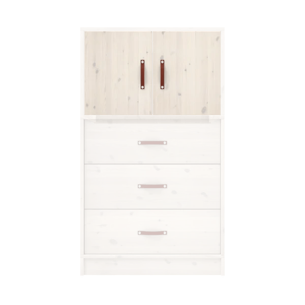 The white lacquered children's furniture from LIFETIME Kidsroom is made of solid pine wood without knots to avoid the typical discolouration and unevenness caused by knots. The surface is treated with environmentally friendly water-based white furniture lacquer and hardened with UV light, which ensures an easy-to-clean and resistant surface. For our white lacquered articles, we use MDF for fronts, fillings, doors and drawer fronts. Due to the use of different materials, there may be slight differences in colour and pattern.