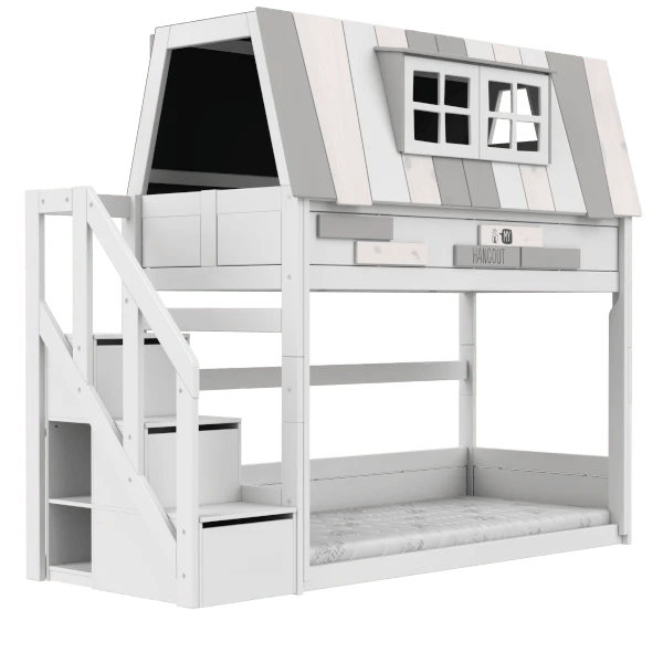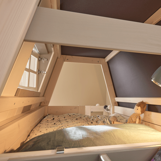 With our low bunk bed Hangout from LIFETIME Kidsrooms, you not only get a bed at floor level, but also an extra sleeping space up high in the playhouse, which includes a stable staircase and opening windows. Kids can spend endless hours with this smart bunk bed with a playhouse on top of the bed!