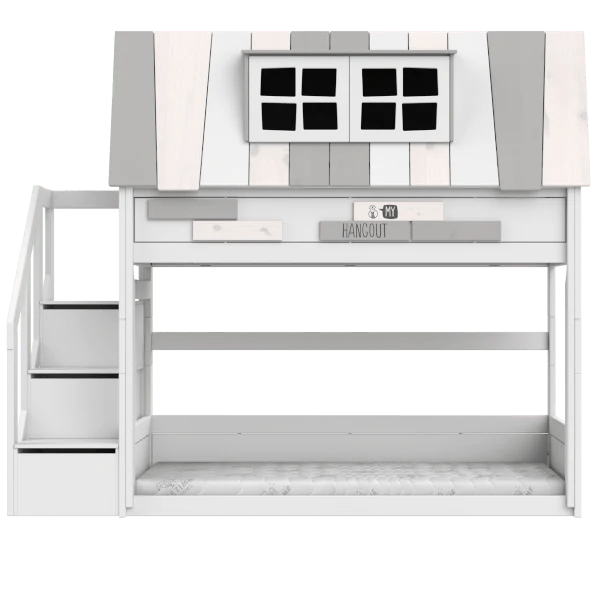 With the sturdy staircase on the side, the child can easily get up and into the playhouse at the top, and the staircase can store all the toys. Very smart if you want more floor space. The lower bunk is at floor level, so even the smallest can sleep here! So nice that all sizes can join in the Hangout adventure.