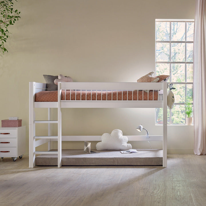 Create the perfect atmosphere and cosy setting in the mid-height bed, where children can play under the bed and sleep up high.